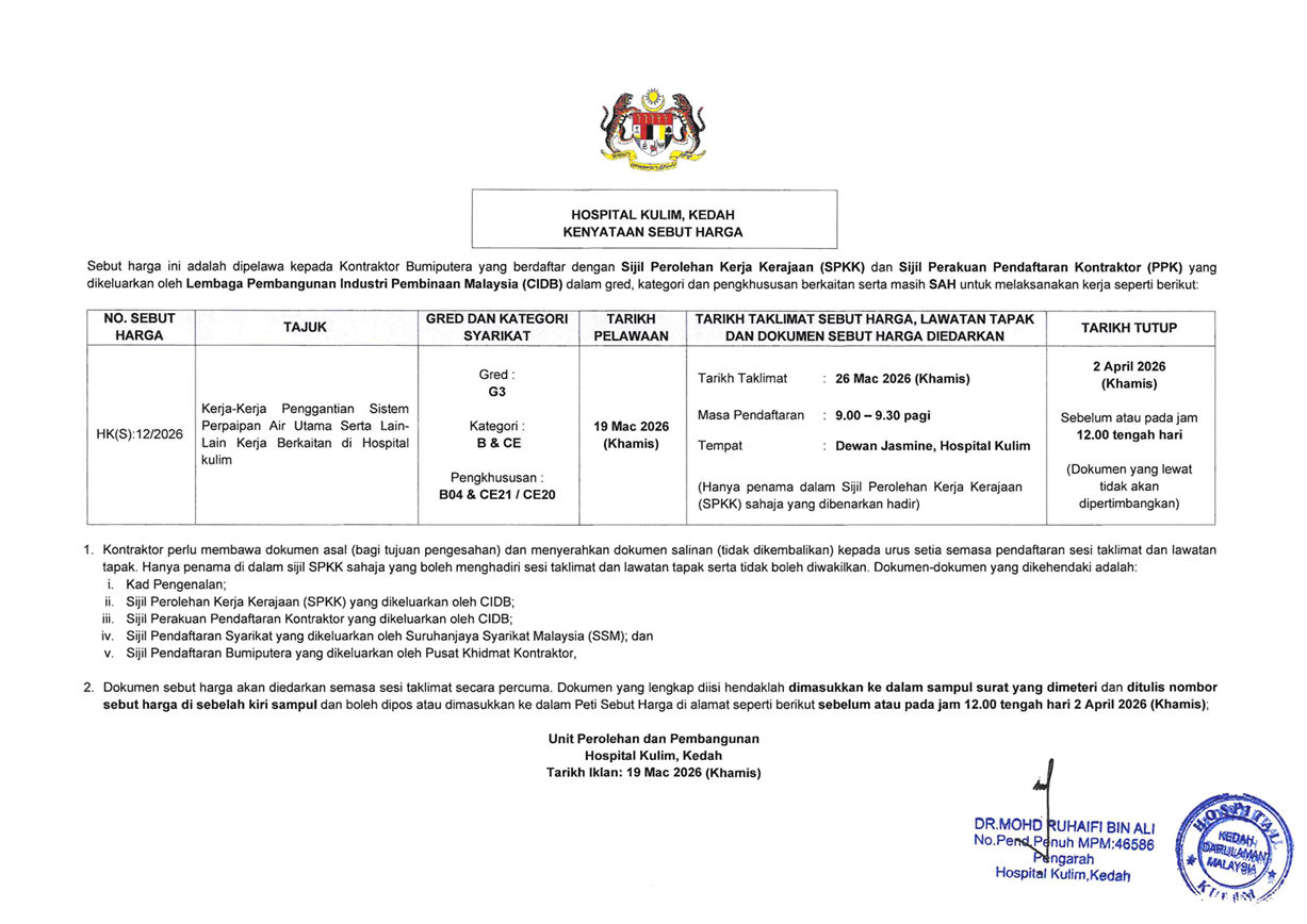 Sebutharga Kerja-Kerja Penggantian Sistem Perpaipan Air Utama Serta Lain-Lain Kerja Berkaitan di Hospital Kulim