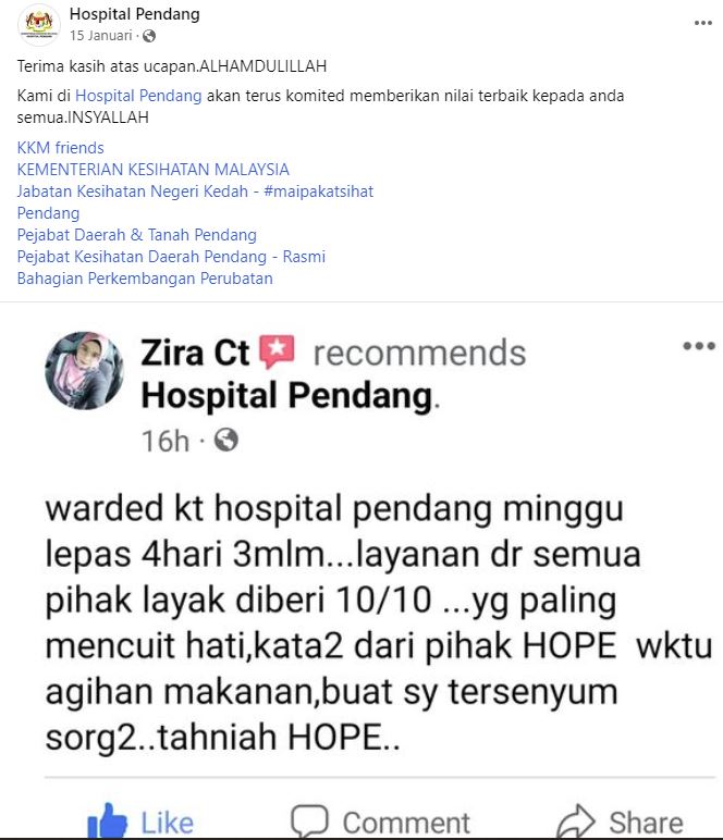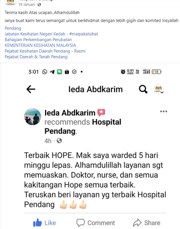 Penghargaan kepada pihak Hospital Pendang, servis anda yang terbaik.