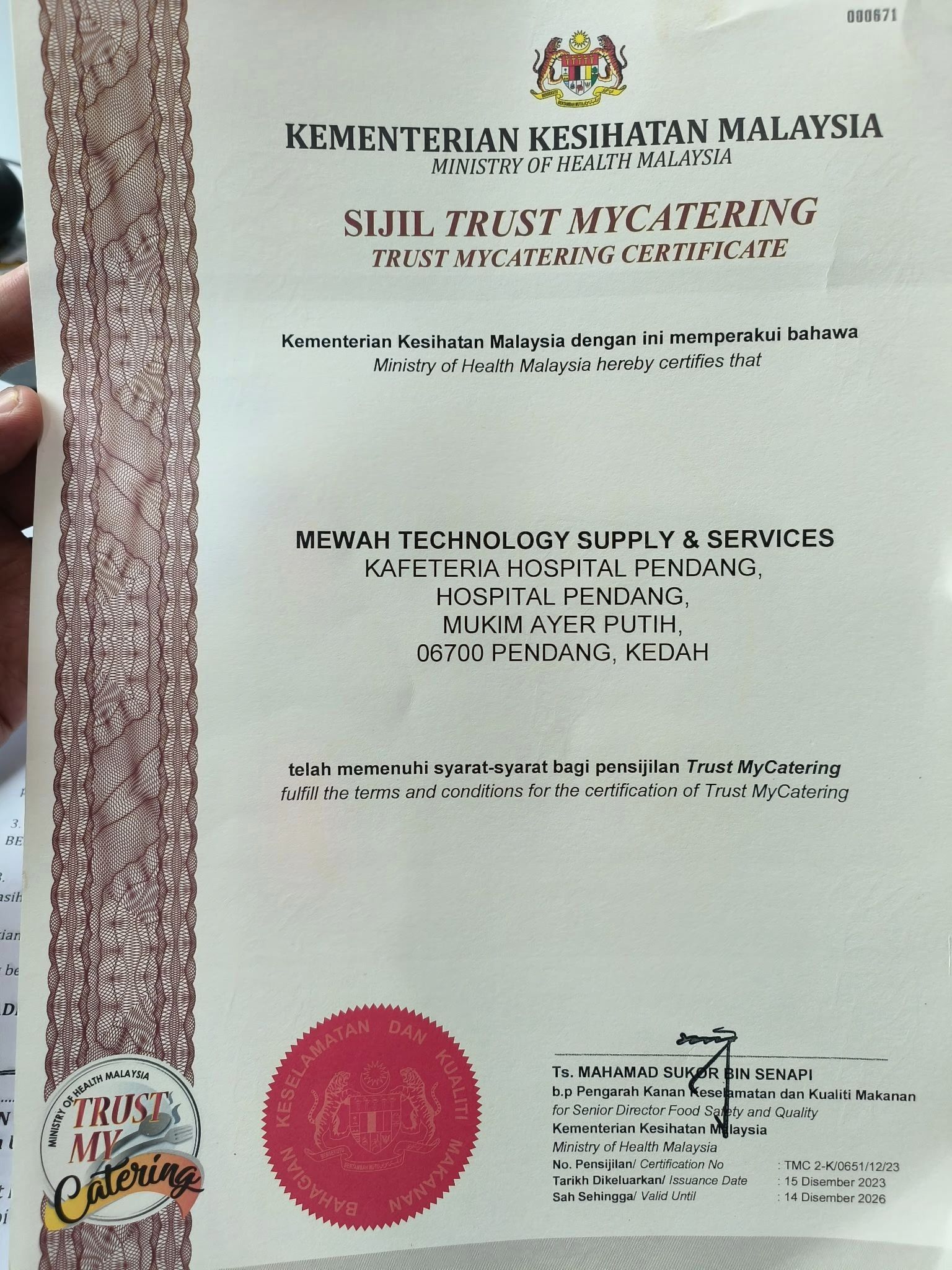 Kafeteria Hospital memperoleh Persijilan TRUST MYCATERING KKM